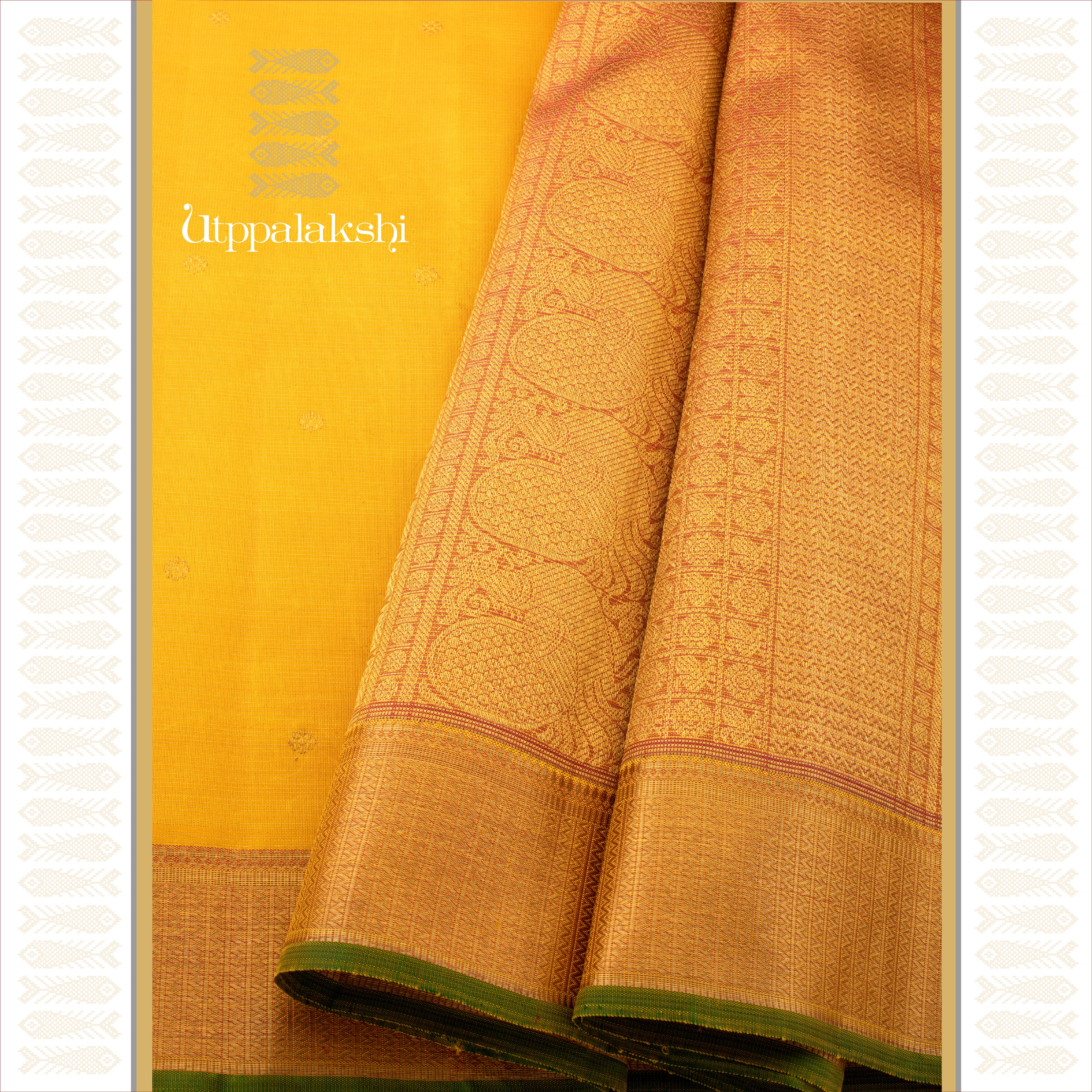 The motifs on Kanjivaram silk sarees are a beautiful nod to tradition, inspired by nature, temples, and ancient mythology. From graceful peacocks to intricate temple borders, each design tells a story rooted in Indian culture. These detailed patterns add elegance, making every saree a timeless piece of art!