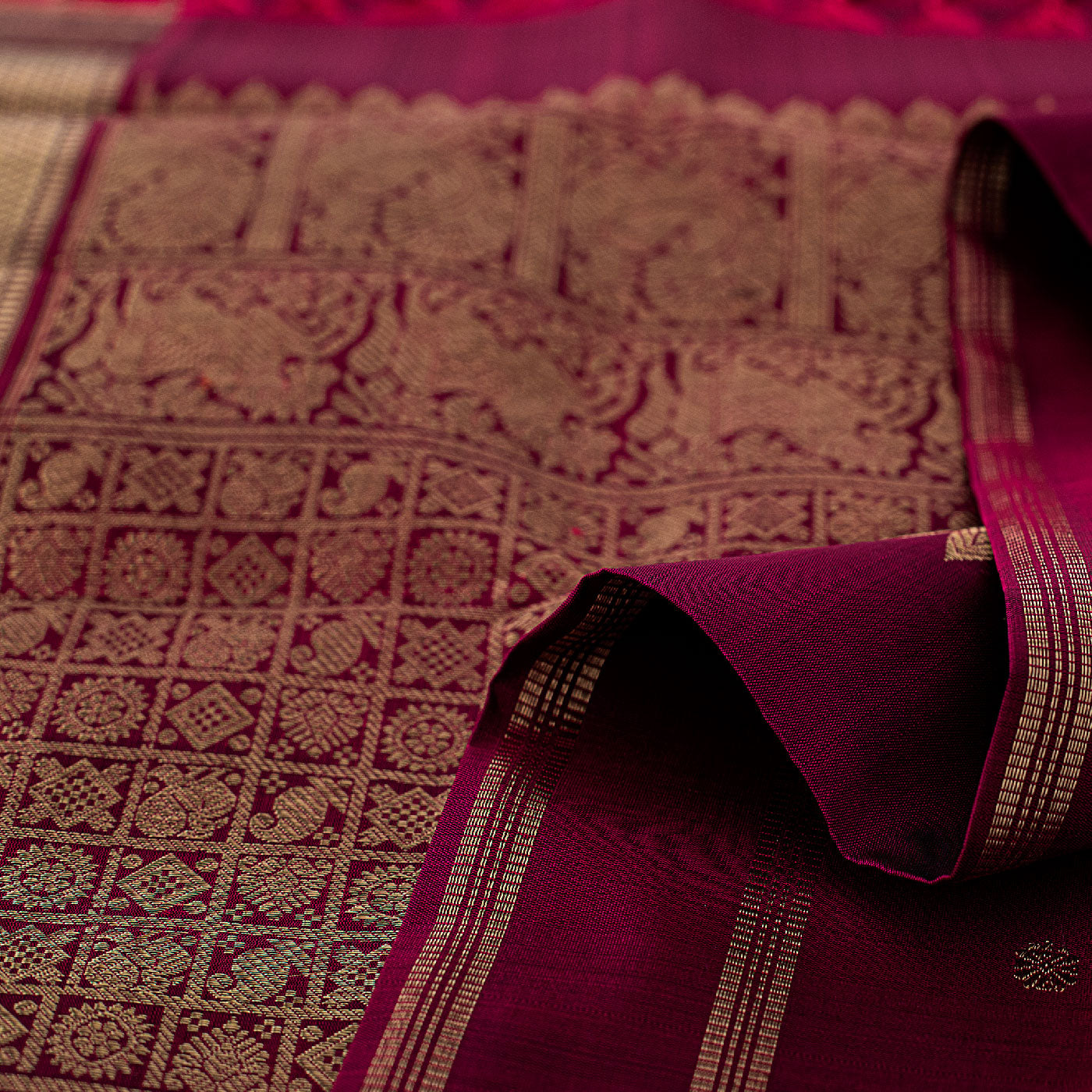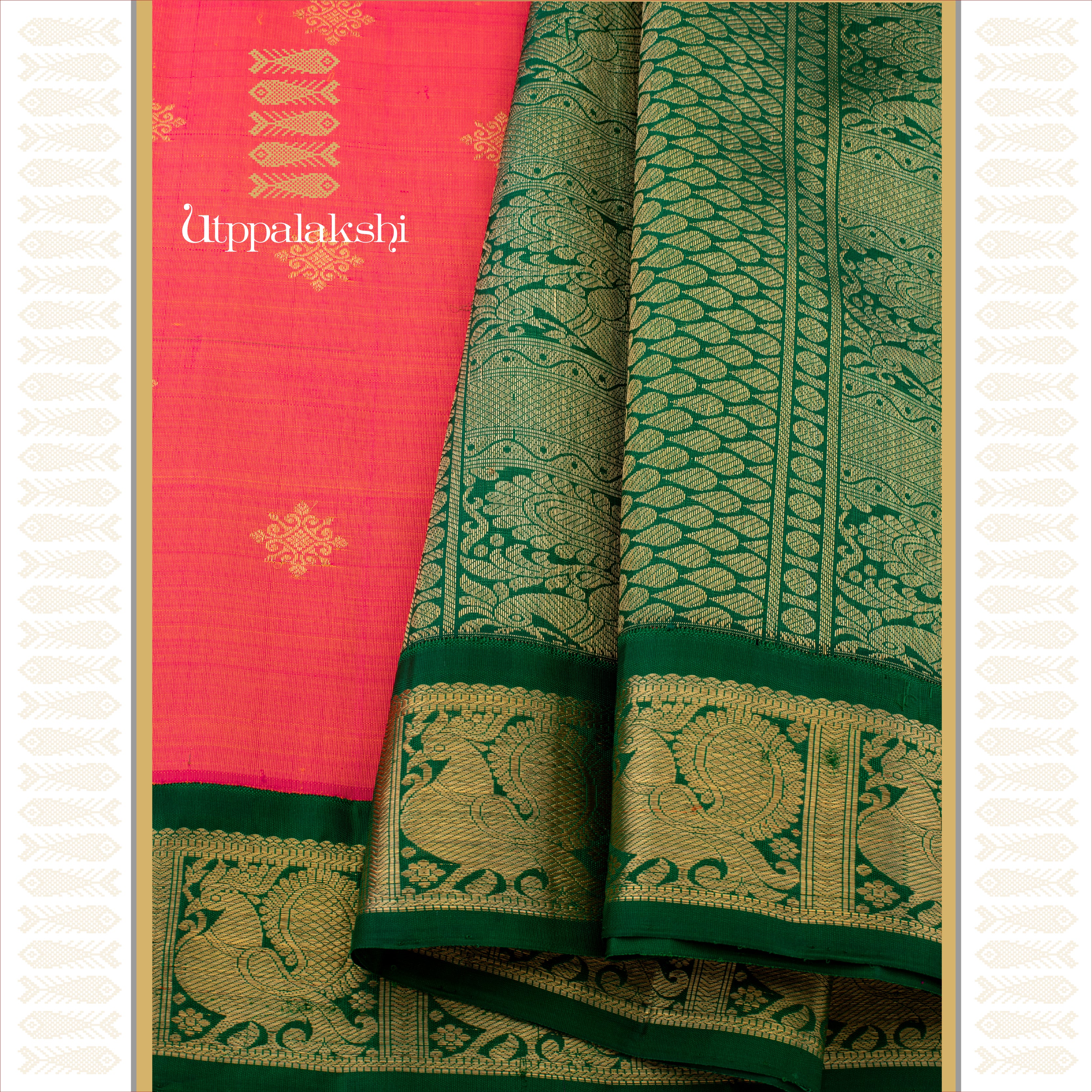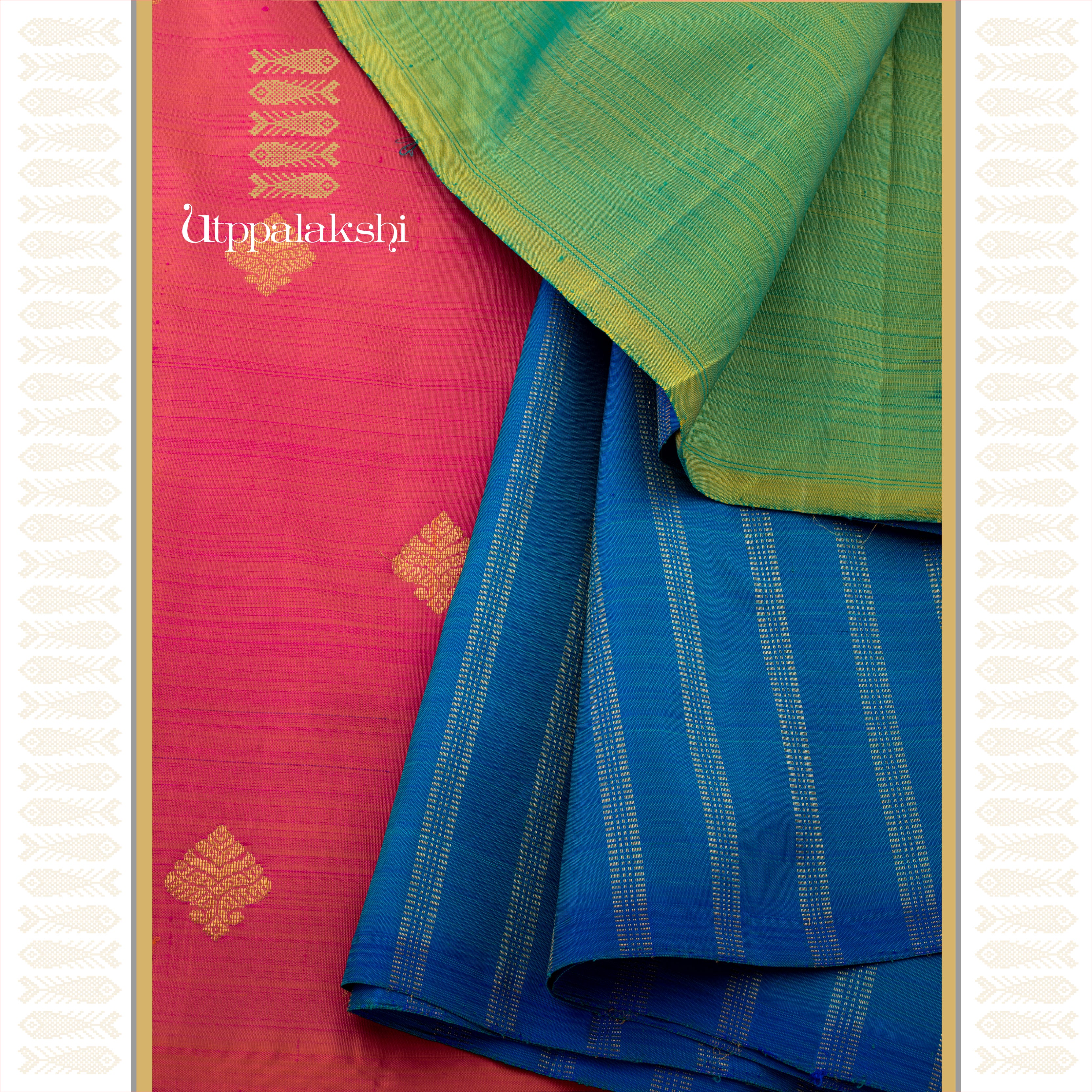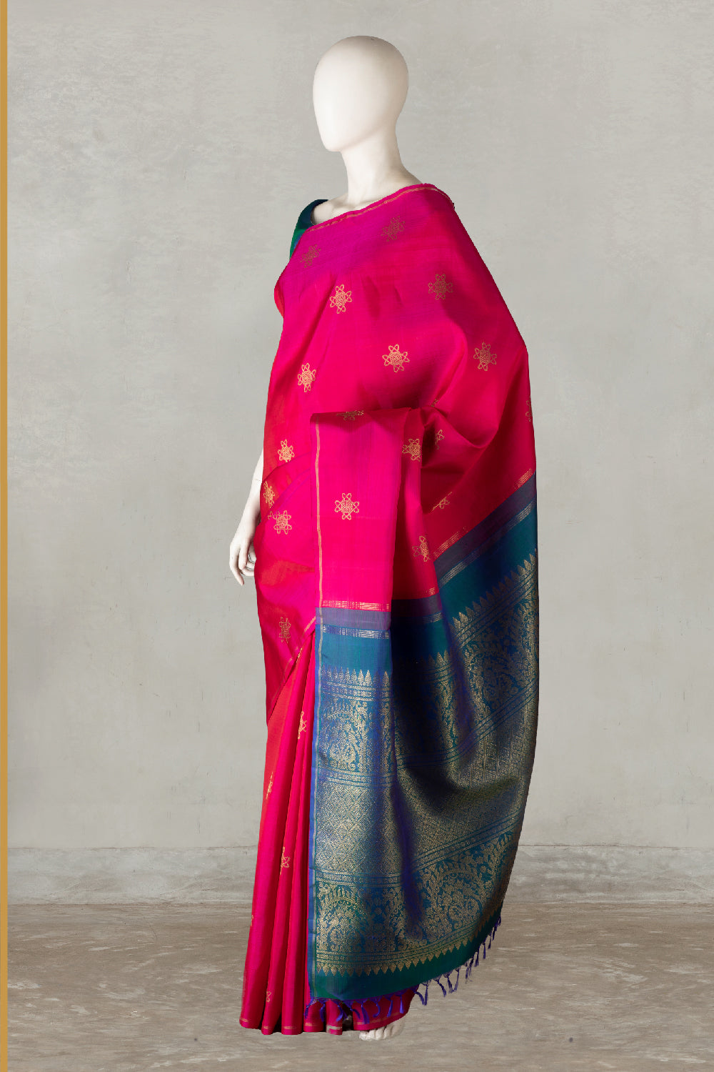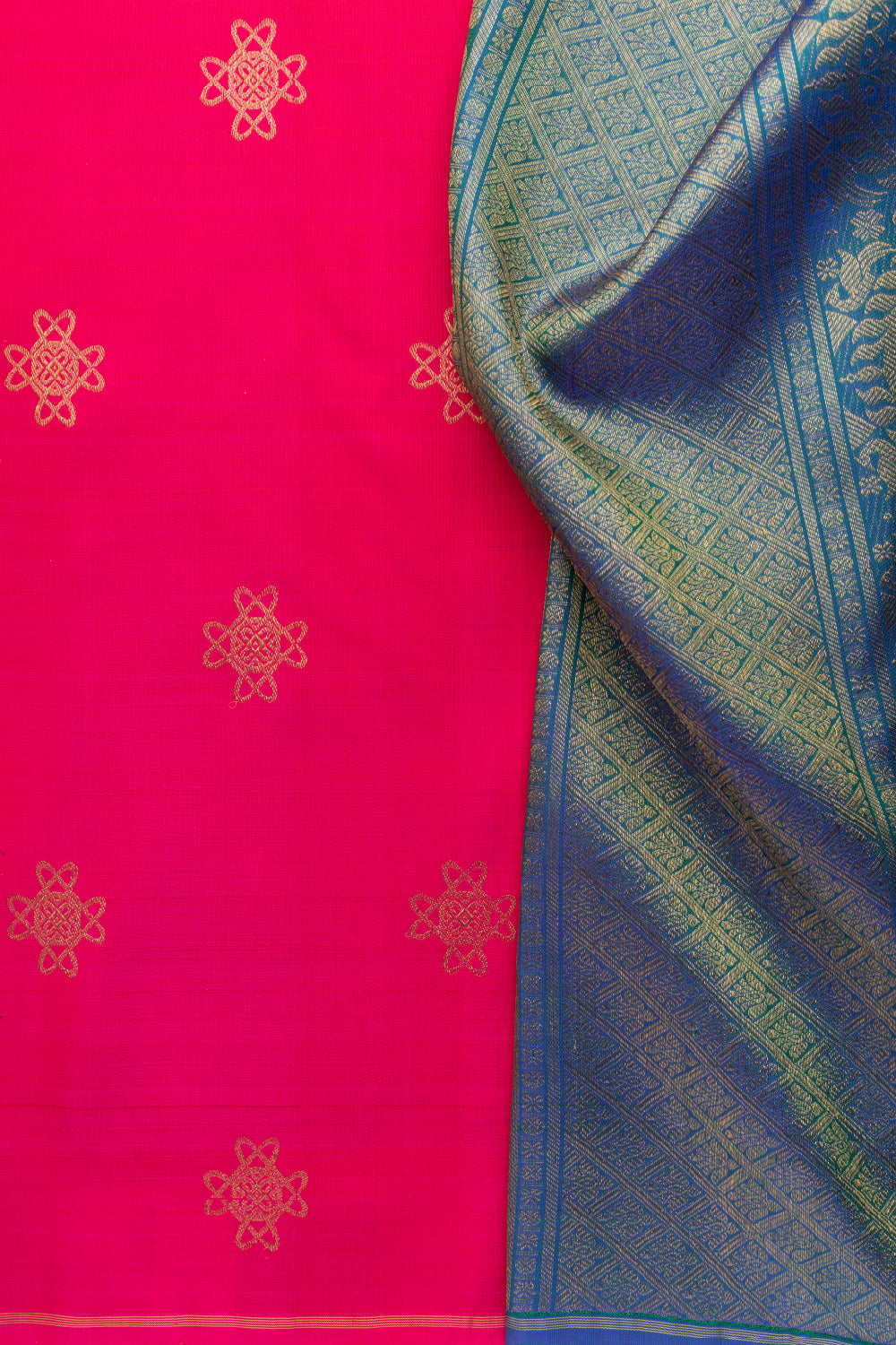 The glory of pink comes alive in this saree which is perfectly paired with a peacock blue pallu. Traditional kolam designs in gold adorn the body while the blue pallu has intricate golden decor of diamonds and peacocks adorn the trellises.